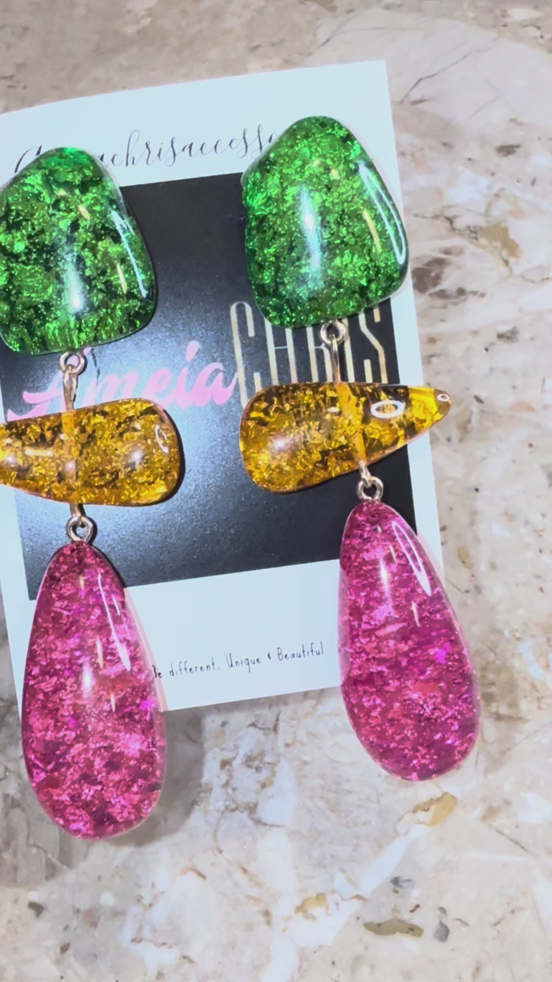 Turn heads with these bold, handcrafted statement earrings featuring a stunning trio of colors. Shimmering emerald green studs flow into golden amber accents, finished with radiant fuchsia teardrops.